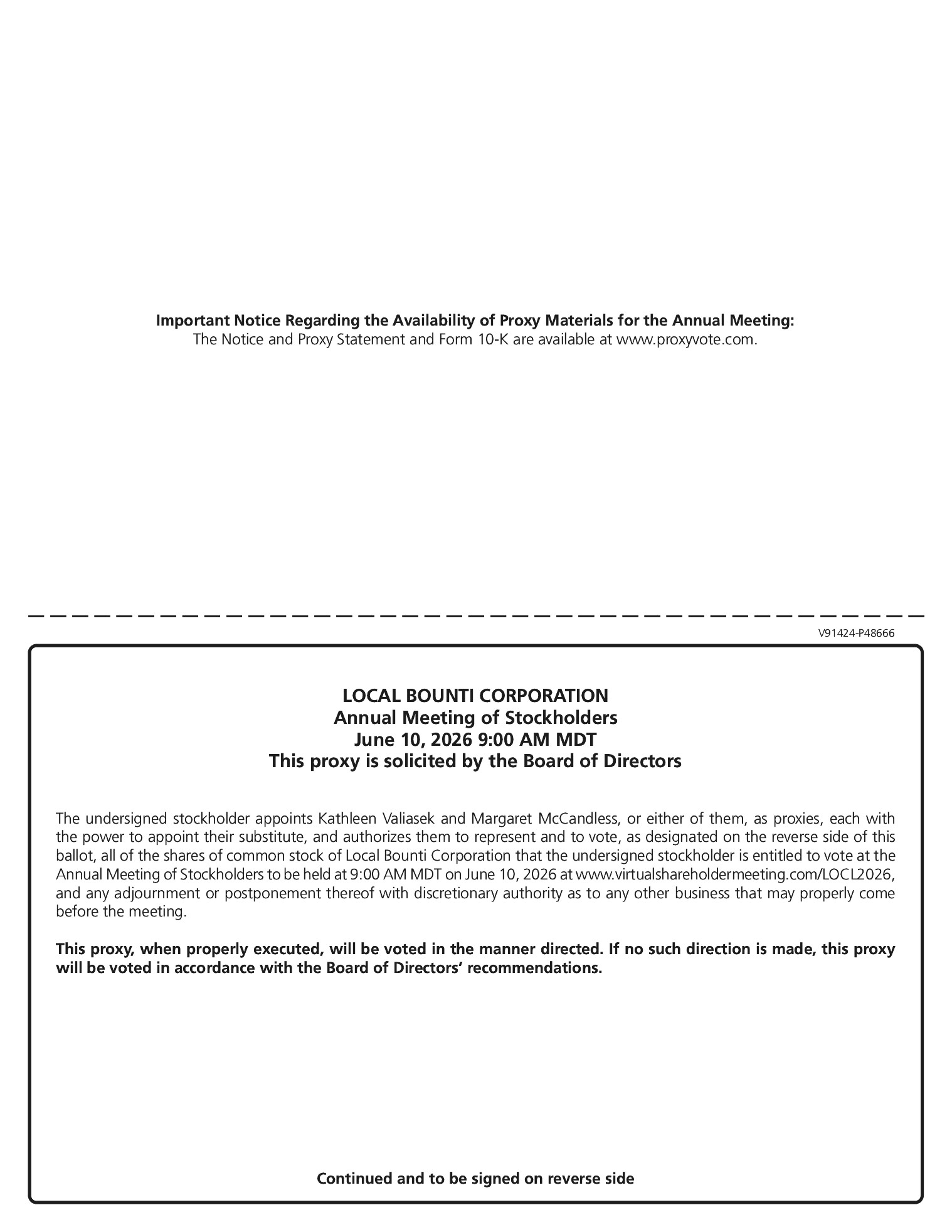 You are cordially invited to attend an annual meeting of stockholders (the “Annual Meeting”) of Local Bounti Corporation (“Local Bounti,” “we,” “us,” or “our”) to be held on June 10, 2026, at 9 a.m. Mountain Time for the following purposes: