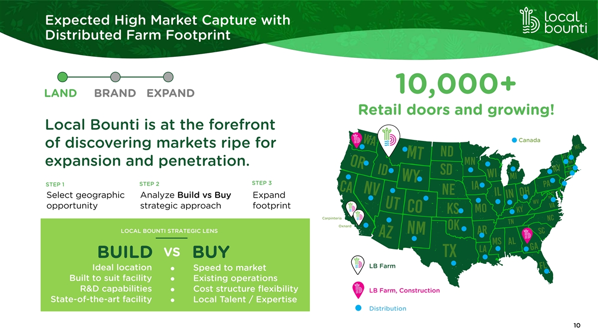 Local Bounti Product Portfolio OUR BRAND PROMISE PESTICIDE 1 FREE Graphic does not depict all active retail SKUs in market today 9 1. Does not include all of Pete’s SKUs. Local Bounti intends to support Pete’s facilities to attain the same certifications.