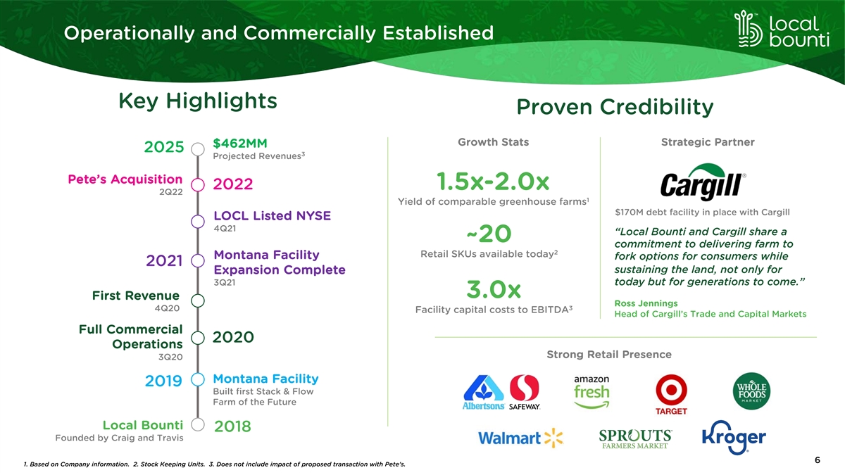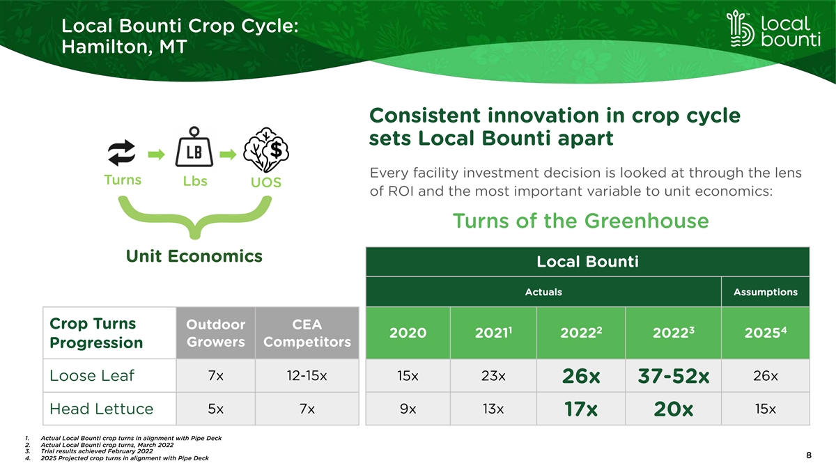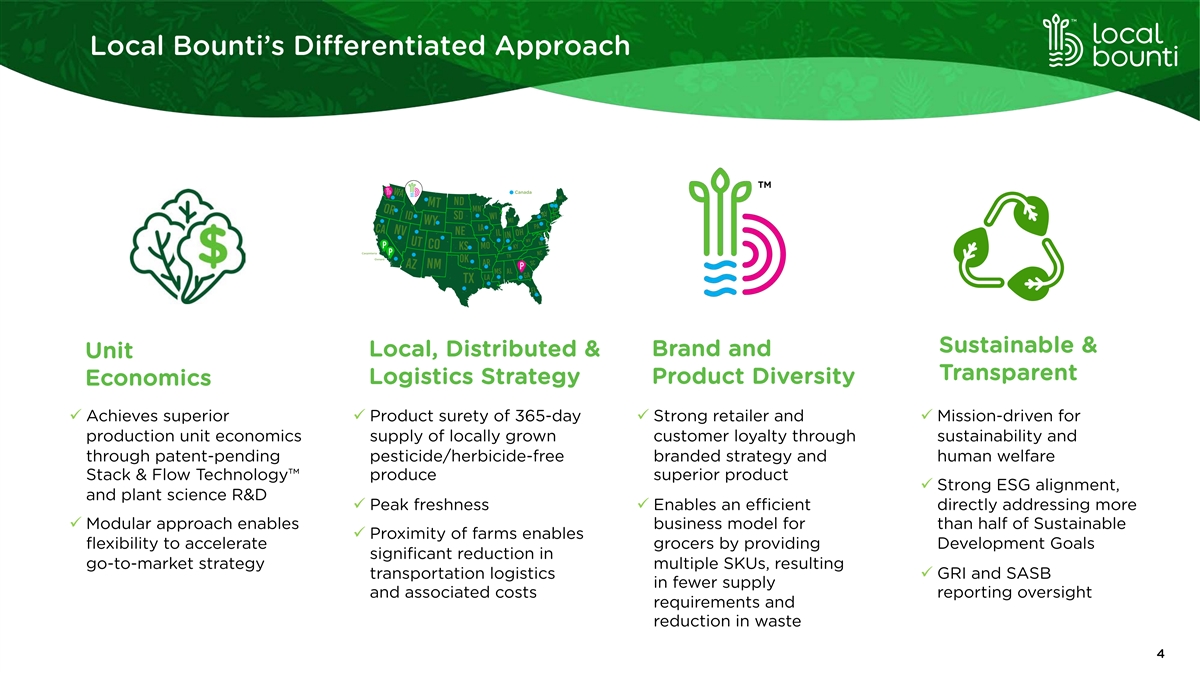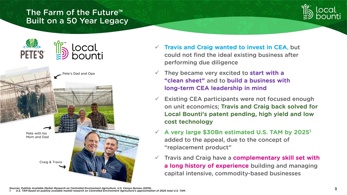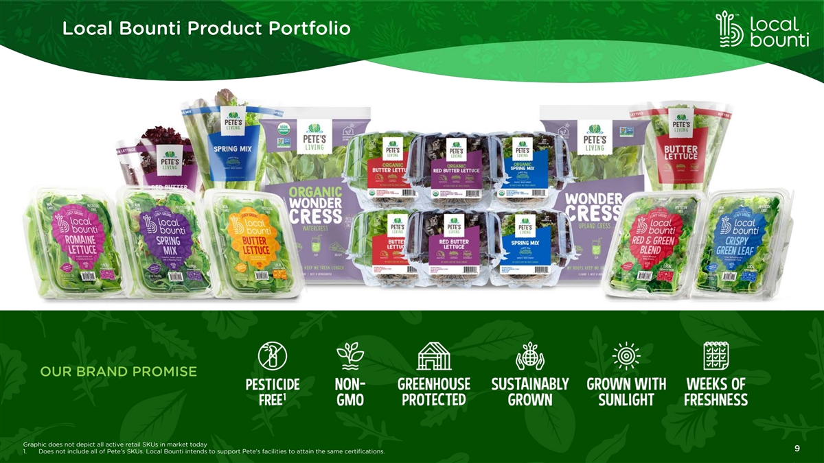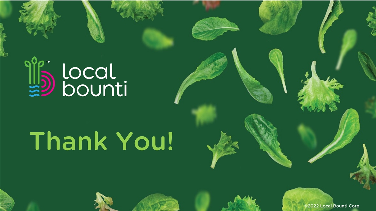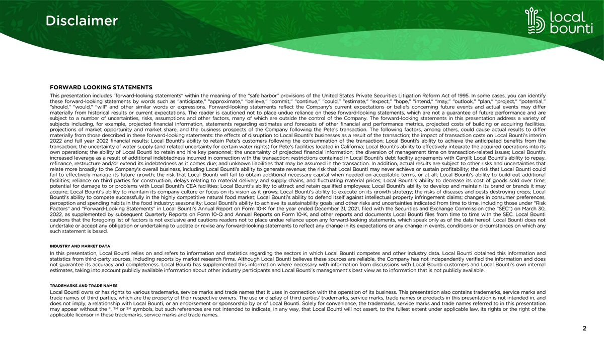 Disclaimer FORWARDLOOKINGSTATEMENTS This presentation includes forward-looking statements within the meaning of the safe harbor provisions of the United States Private Securities Litigation Reform Act of 1995. In some cases, you can identify these forward-looking statements by words such as anticipate, approximate, believe, commit, continue, could, estimate, expect, hope, intend, may, outlook, plan, project, potential, should, would, will and other similar words or expressions. Forward-looking statements reflect the Company's current expectations or beliefs concerning future events and actual events may differ materially from historical results or current expectations. The reader is cautioned not to place undue reliance on these forward-looking statements, which are not a guarantee of future performance and are subject to a number of uncertainties, risks, assumptions and other factors, many of which are outside the control of the Company. The forward-looking statements in this presentation address a variety of subjects including, for example, projected financial information, statements regarding estimates and forecasts of other financial and performance metrics, projected costs of building or acquiring facilities, projections of market opportunity and market share, and the business prospects of the Company following the Pete’s transaction. The following factors, among others, could cause actual results to differ materially fromthose describedin these forward-looking statements: the effects of disruption to Local Bounti's businesses as a result of the transaction; the impact of transaction costs on Local Bounti's interim 2022 and full year 2022 financial results; Local Bounti's ability to retain Pete's customers following the consummation of the transaction; Local Bounti's ability to achieve the anticipated benefits from the transaction; the uncertainty of water supply(and related uncertaintyfor certain water rights) for Pete's facilities locatedin California; Local Bounti's abilityto effectivelyintegrate the acquired operationsintoits own operations; the ability of Local Bounti to retain and hire key personnel; the uncertainty of projected financial information; the diversion of management time on transaction-related issues; Local Bounti's increased leverage as a result of additional indebtedness incurred in connection with the transaction; restrictions contained in Local Bounti's debt facility agreements with Cargill; Local Bounti's ability to repay, refinance, restructure and/or extend its indebtedness as it comes due; and unknown liabilities that may be assumed in the transaction. In addition, actual results are subject to other risks and uncertainties that relate more broadly to the Company's overall business, including Local Bounti's ability to generate revenue; the risk that Local Bounti may never achieve or sustain profitability; the risk that Local Bounti could fail to effectively manage its future growth; the risk that Local Bounti will fail to obtain additional necessary capital when needed on acceptable terms, or at all; Local Bounti's ability to build out additional facilities; reliance on third parties for construction, delays relating to material delivery and supply chains, and fluctuating material prices; Local Bounti's ability to decrease its cost of goods sold over time; potential for damage to or problems with Local Bounti's CEA facilities; Local Bounti's ability to attract and retain qualified employees; Local Bounti's ability to develop and maintain its brand or brands it may acquire; Local Bounti's ability to maintain its company culture or focus on its vision as it grows; Local Bounti's ability to execute on its growth strategy; the risks of diseases and pests destroying crops; Local Bounti's ability to compete successfully in the highly competitive natural food market; Local Bounti's ability to defend itself against intellectual property infringement claims; changes in consumer preferences, perceptionandspending habitsinthe foodindustry; seasonality; Local Bounti's abilitytoachieveits sustainability goals; andother risks anduncertaintiesindicatedfromtime totime, includingthose under Risk Factors and Forward-Looking Statements in Local Bounti's Annual Report on Form 10-K for the year ended December 31, 2021, filed with the Securities and Exchange Commission (the “SEC”) on March 30, 2022, as supplemented by subsequent Quarterly Reports on Form 10-Q and Annual Reports on Form 10-K, and other reports and documents Local Bounti files from time to time with the SEC. Local Bounti cautions that the foregoing list of factors is not exclusive and cautions readers not to place undue reliance upon any forward-looking statements, which speak only as of the date hereof. Local Bounti does not undertakeoracceptanyobligationorundertakingtoupdateorreviseanyforward-lookingstatementstoreflectanychangeinitsexpectationsoranychangeinevents, conditionsorcircumstancesonwhichany suchstatementisbased. INDUSTRYANDMARKETDATA In this presentation, Local Bounti relies on and refers to information and statistics regarding the sectors in which Local Bounti competes and other industry data. Local Bounti obtained this information and statistics from third-party sources, including reports by market research firms. Although Local Bounti believes these sources are reliable, the Company has not independently verified the information and does not guarantee its accuracy and completeness. Local Bounti has supplemented this information where necessary with information from discussions with Local Bounti customers and Local Bounti’s own internal estimates, takingintoaccountpubliclyavailableinformationaboutotherindustryparticipantsandLocal Bounti’s management’sbestviewastoinformationthatisnotpubliclyavailable. TRADEMARKSANDTRADENAMES Local Bounti owns or has rights to various trademarks, service marks and trade names that it uses in connection with the operation of its business. This presentation a
