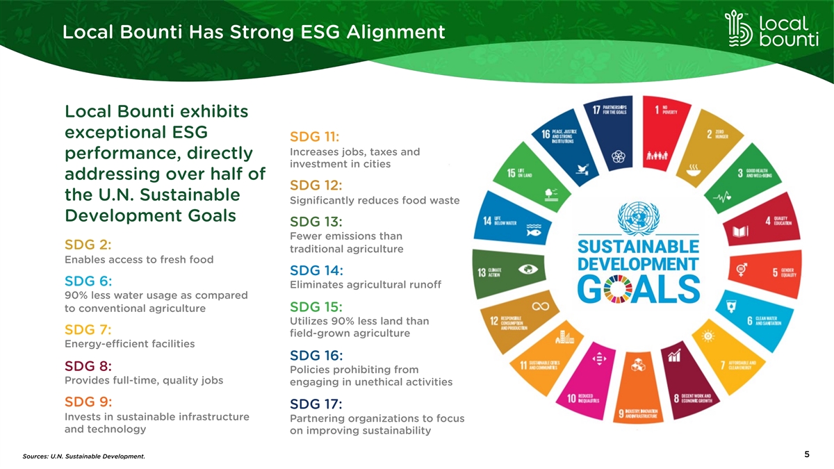 Local Bounti’s Differentiated Approach Canada Carpinteria Oxnard Sustainable & Local, Distributed & Brand and Unit Transparent Logistics Strategy Product Diversity Economics ü Achieves superior ü Product surety of 365-day ü Strong retailer and ü Mission-driven for production unit economics supply of locally grown customer loyalty through sustainability and through patent-pending pesticide/herbicide-free branded strategy and human welfare Stack & Flow Technology™ produce superior product ü Strong ESG alignment, and plant science R&D ü Peak freshness ü Enables an efficient directly addressing more ü Modular approach enables business model for than half of Sustainable ü Proximity of farms enables flexibility to accelerate grocers by providing Development Goals significant reduction in go-to-market strategy multiple SKUs, resulting transportation logistics ü GRI and SASB in fewer supply and associated costs reporting oversight requirements and reduction in waste 4