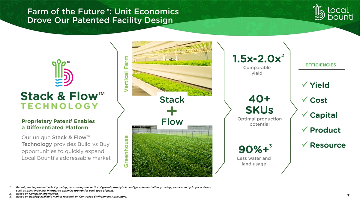 Operationally and Commercially Established Key Highlights Proven Credibility Growth Stats Strategic Partner $462MM 2025 3 Projected Revenues Pete’s Acquisition 2022 1.5x-2.0x 2Q22 1 Yield of comparable greenhouse farms $170M debt facility in place with Cargill LOCL Listed NYSE 4Q21 “Local Bounti and Cargill share a ~20 commitment to delivering farm to 2 Retail SKUs available today Montana Facility fork options for consumers while 2021 sustaining the land, not only for Expansion Complete today but for generations to come.” 3Q21 3.0x First Revenue Ross Jennings 3 4Q20 Facility capital costs to EBITDA Head of Cargill’s Trade and Capital Markets Full Commercial 2020 Operations Strong Retail Presence 3Q20 Montana Facility 2019 Built first Stack & Flow Farm of the Future Local Bounti 2018 Founded by Craig and Travis 6 1. Based on Company information. 2. Stock Keeping Units. 3. Does not include impact of proposed transaction with Pete's.